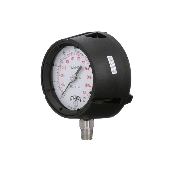 Manómetro StabiliZR de Proceso PPC-ZR de Winters, destaca por su movimiento amortiguado StabiliZR®, que minimiza de manera efectiva los efectos de pulsaciones y vibraciones, ofreciendo la misma precisión que los manómetros llenos de líquido. Su carcasa robusta presenta un frente fenólico sólido y un tapón de escape de sobrepresión de polipropileno, garantizando durabilidad y protección. Con una precisión de ±0.5%, el manómetro incorpora un mecanismo rotativo completo de Acero Inoxidable, permitiendo mediciones fiables y exactas. El puntero ajustable micrométricamente facilita la calibración, mientras que los topes de bajo y sobrecarga aseguran la integridad del instrumento.